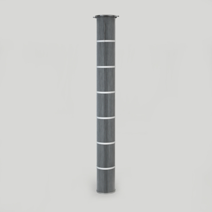 Cartridge Filter with open top end cap with 4 hooks, 300 mm pitch diameter and closed bottom end cap in Polyester Spunbond with PTFE Coating, 216 mm outer diameter x 2000 mm long, Special features: Glued and Dirty and Clean Air Plenum Installation for different brands of cartridge collectors